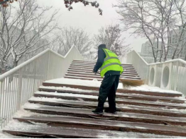 即下即清,降雪伊始,对城区主次干道、桥梁、坡道等重点区域进行不间断巡查,实时掌握路面雪情和结冰情况。针对路面及人行道出现的积雪,连夜开展清扫作业,防止积雪压实结冰。全面清理公园积雪,对公园内主要园路、台阶、游乐设施等区域的积雪进行集中清扫,设置安全提示牌,保障市民游园安全。园林养护人员则使用长杆等工具,细心清理苗木树木上的积雪,防止枝条折断倒伏,保护绿化成果,确保道路和公共区域畅通安全。各执法中队加强市容环境巡查,督促沿街商户落实“门前三包”责任,自觉清扫门前积雪。加强市政设施巡查,对路面井盖、路沿石等设施进行排查,发现破损问题,立即组织应急维修队伍进行快速修复,消除安全隐患。