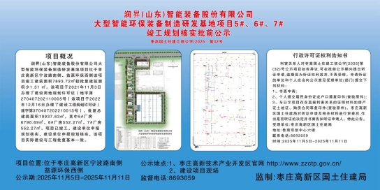 润昇(山东)智能装备股份有限公司 大型智能环保装备制造研发基地项目5#、6#、7# 竣工规划核实批前公示