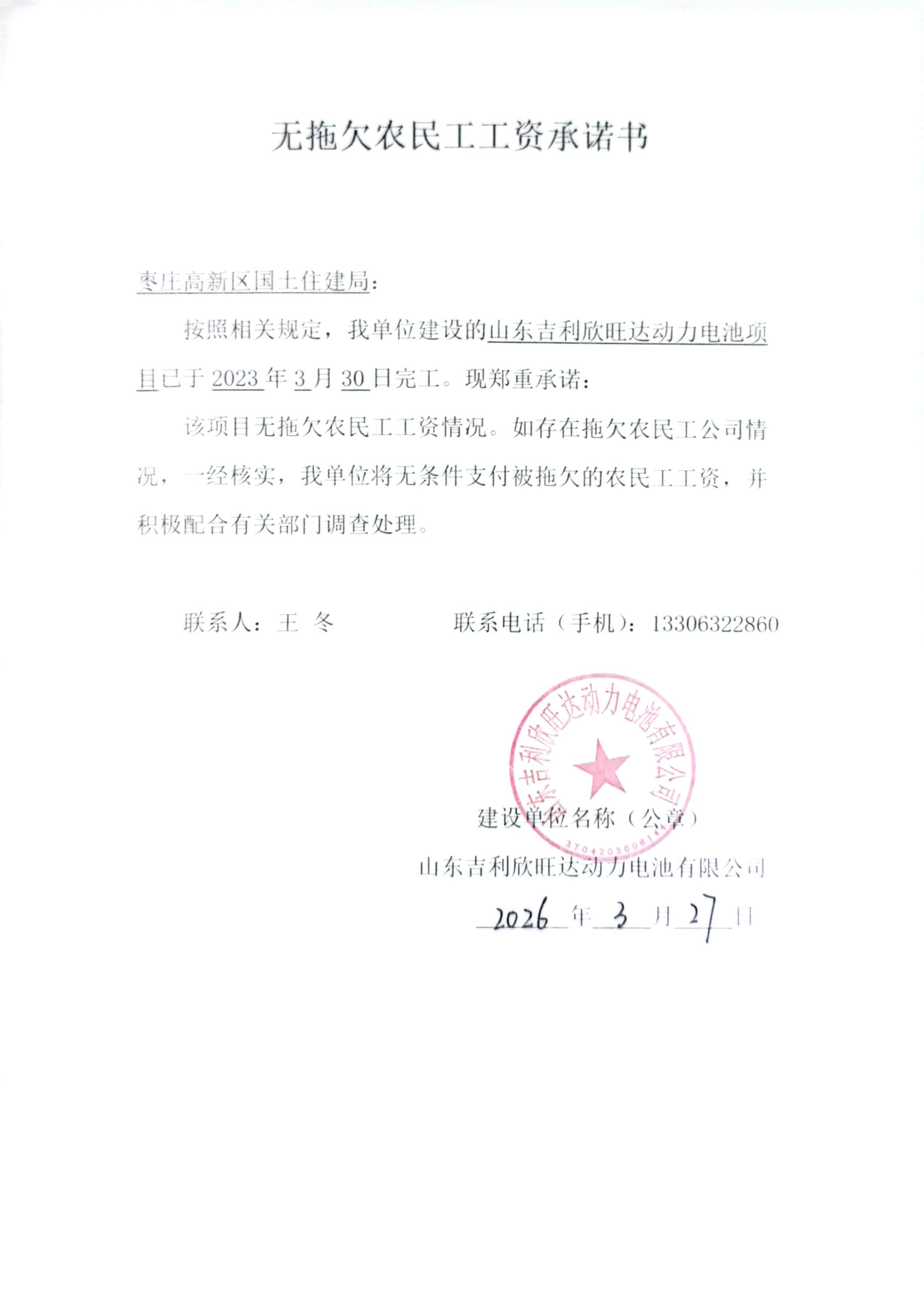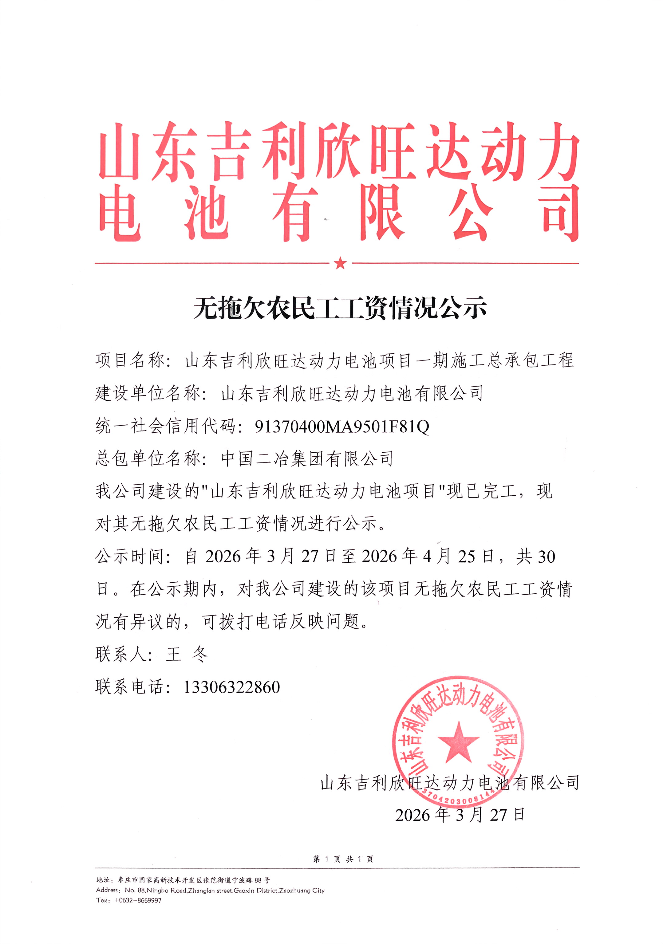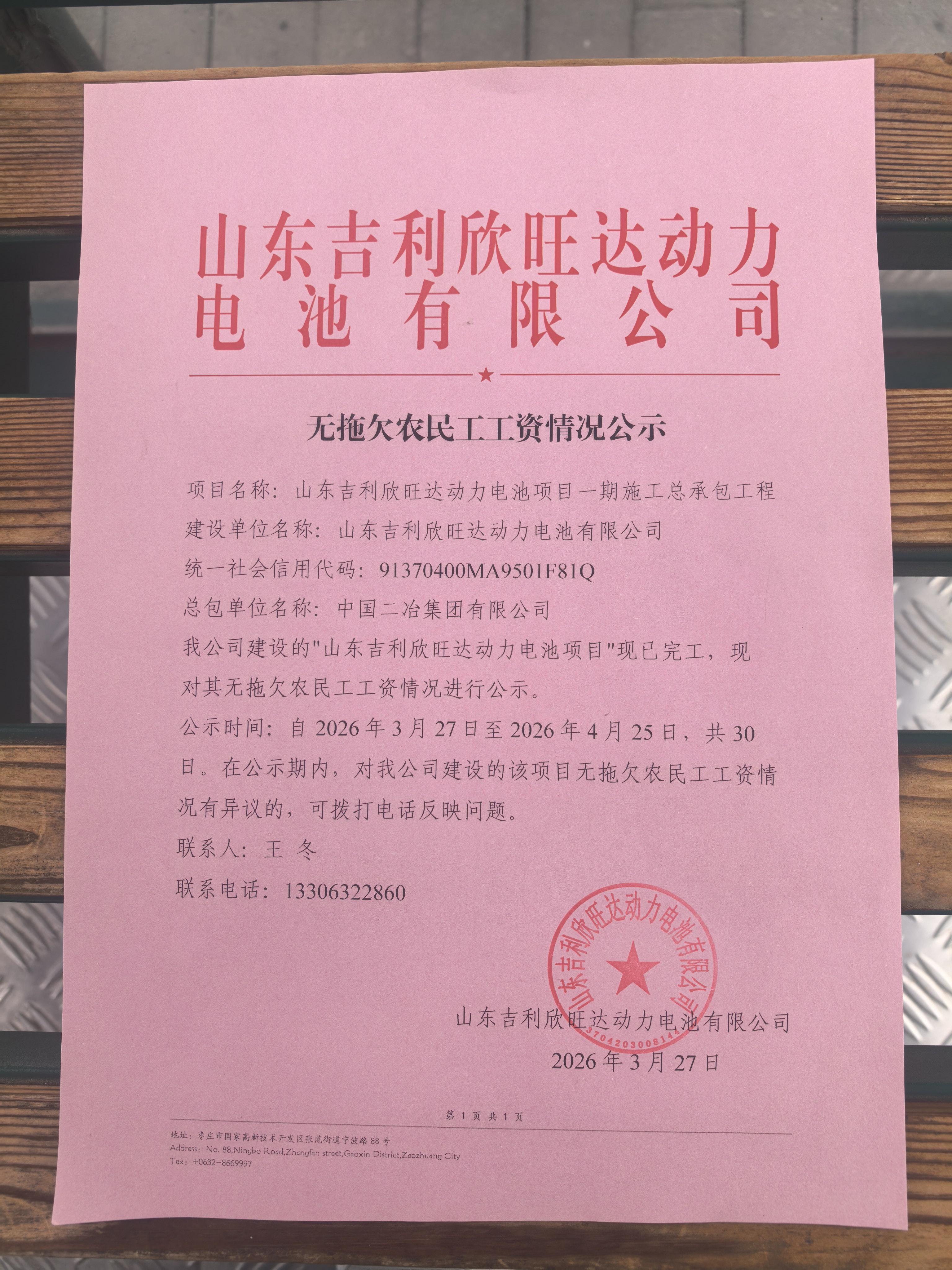 事项:"山东吉利欣旺达动力电池项目"现已完工,现对其无拖欠农民工工资情况进行公示。