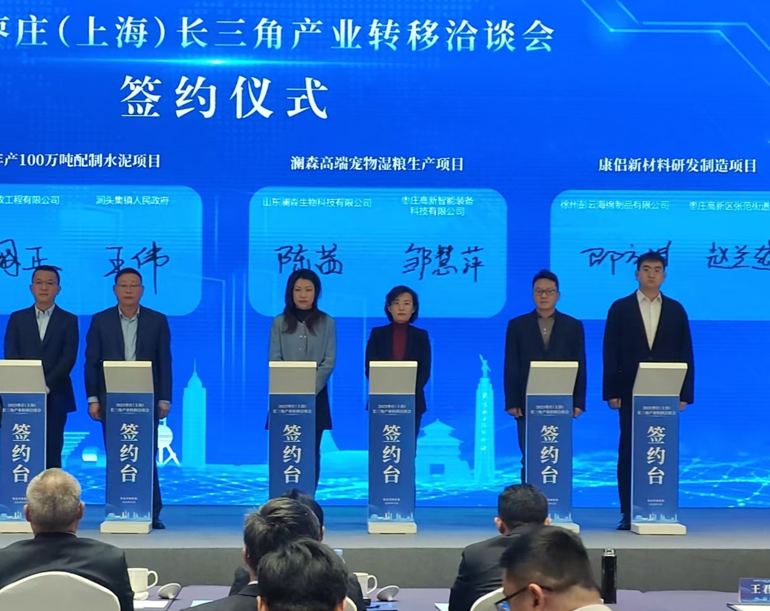 12月2日下午,澜森高端宠物湿粮生产项目签约仪式在2025枣庄(上海)长三角产业转移洽谈会上举行,仪式上,智能装备公司执行董事邹慧萍同项目负责人陈茜签约。智能装备公司副总经理李新春参加。