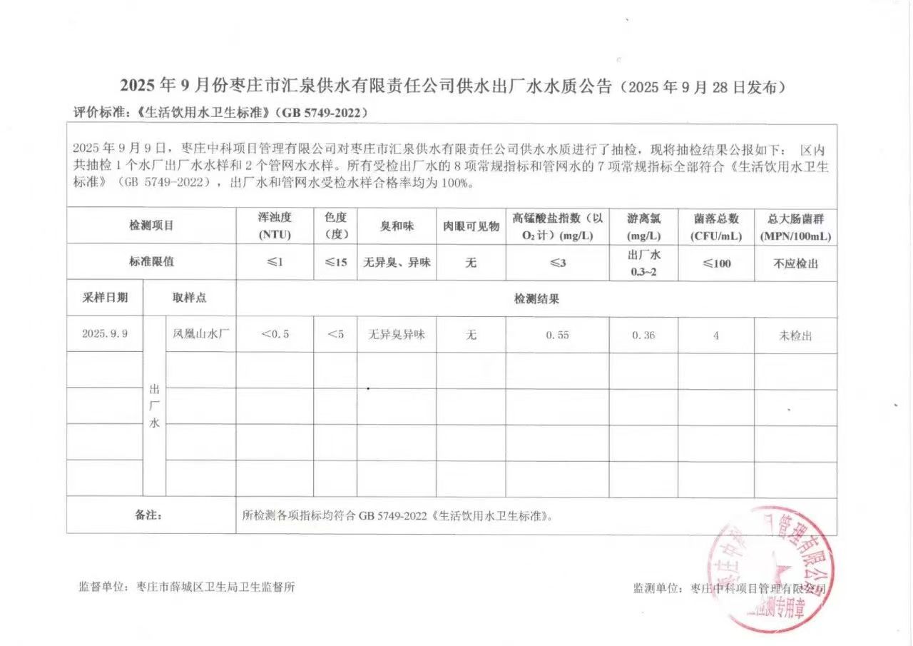 【水质信息】枣庄市汇泉供水有限公司2025年9月出厂水水质公告