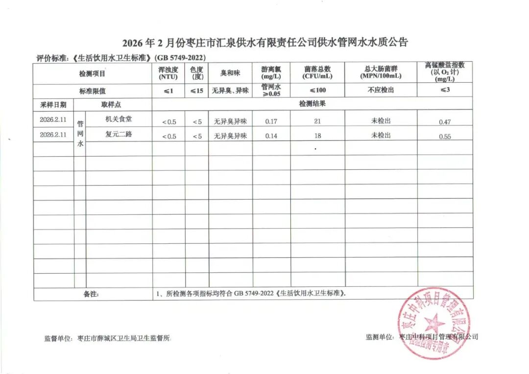 • 标  题:2026年第一季度枣庄市汇泉供水有限责任公司供水管网水水质公告
