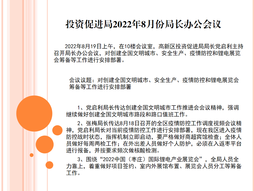 • 标  题:投资促进局2022年8月份局长办公会议解读