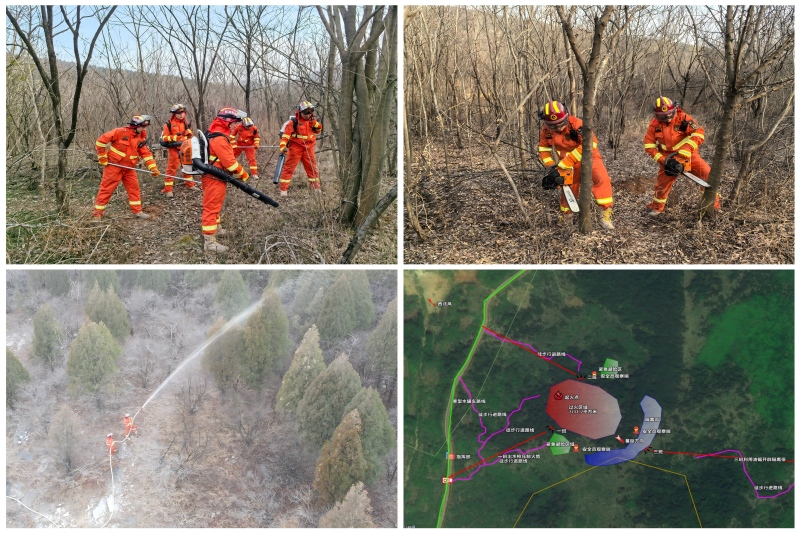 到达火场后,指挥员第一时间组织人员勘察现场,依托奥维互动地图精准标绘火场态势、蔓延方向和危险区域,结合地形地貌和火势强度,科学划分作战区域,明确各班组职责分工,制定针对性扑救方案。演练过程中,各班组协同作战、配合默契,作业流程规范有序。一班利用消防车+串联泵从火场右翼搭建供水线路,出水枪形成密集水幕压制火势蔓延;二班队员携带风力灭火机、二号工具等装备,从左翼切入火场,采取“边打边清、分段推进”的方式,清理余火、铲除火点;三班则使用油锯快速开设防火隔离带,切断火势蔓延路径,严防火灾复燃。