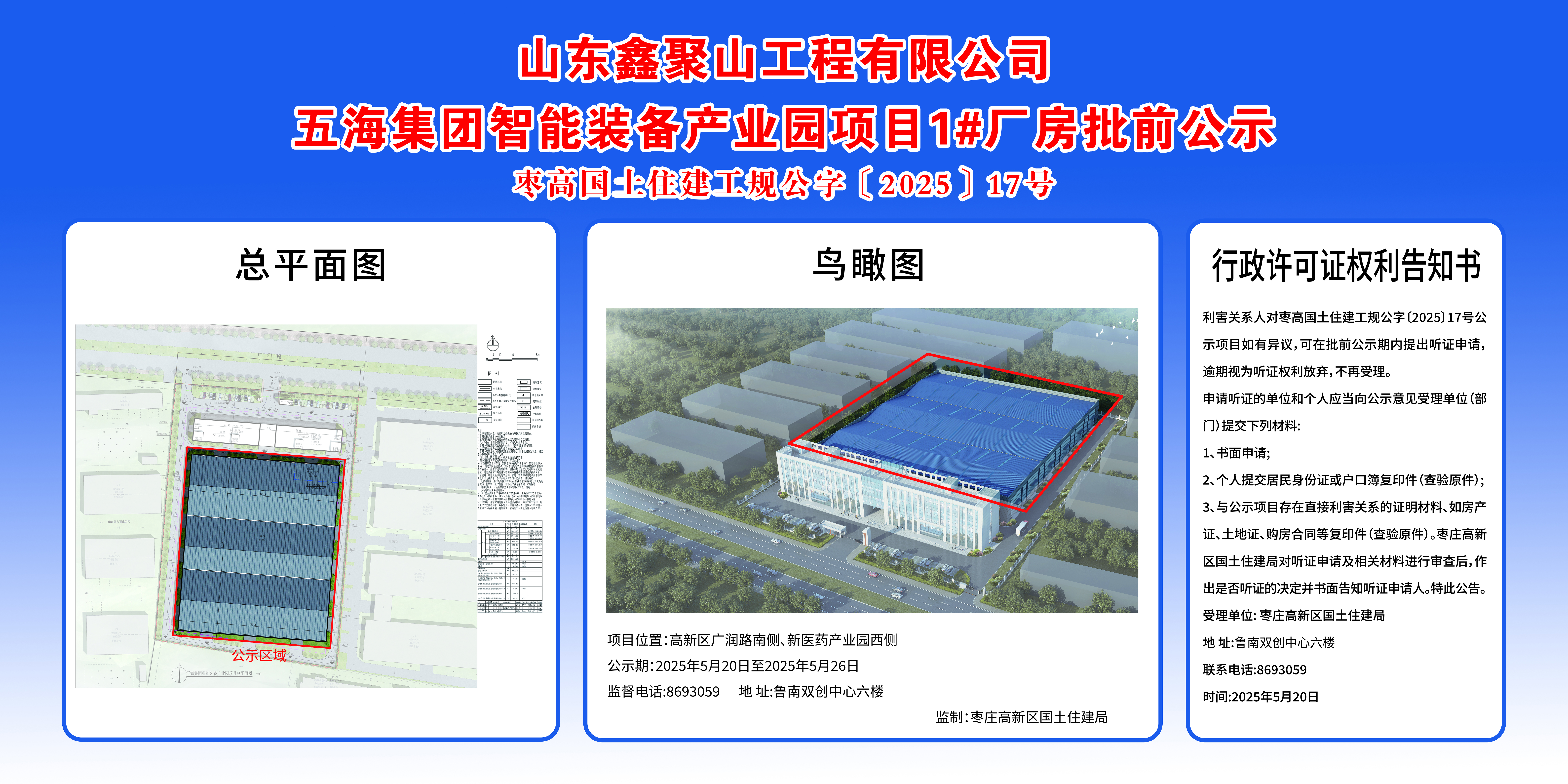 山东鑫聚山工程有限公司五海集团智能装备产业园项目1#厂房批前公示
