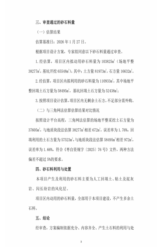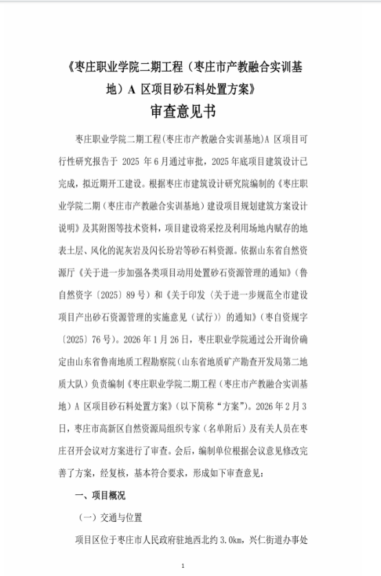 2026年2月6日,高新区国土住建局组织专家对《枣庄职业技术学院二期工程(枣庄市产教融合实训基地)A区项目砂石料处置方案》(以下简称《方案》)进行了现场踏勘和会议评审。专家组认为,《方案》内容全面、依据充分、措施可行,符合省、市相关政策要求,原则同意通过评审,并提出了修改建议。枣庄职业学院已按专家组意见修改完善。经复核,修改后的《方案》符合要求,高新区国土住建局同意专家组评审意见。