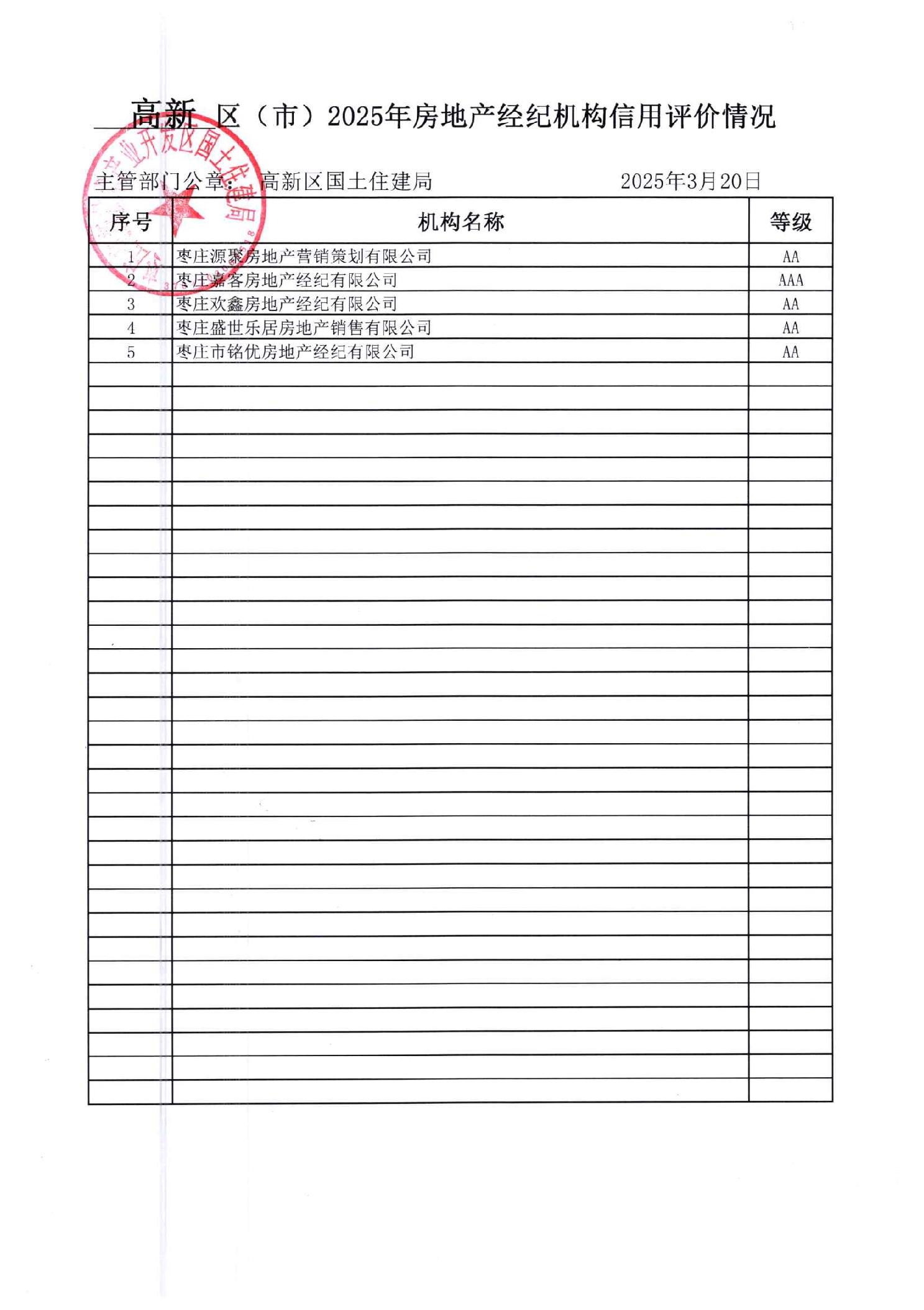 高新区2025房地产经纪机构信用评价情况