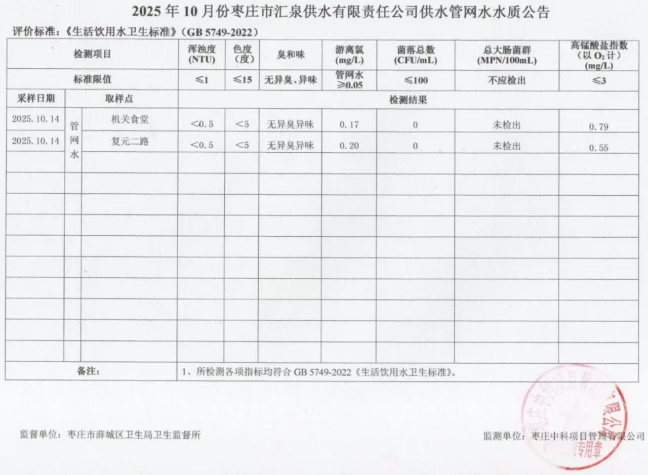 【水质信息】枣庄市汇泉供水有限公司2025年10月供水管网