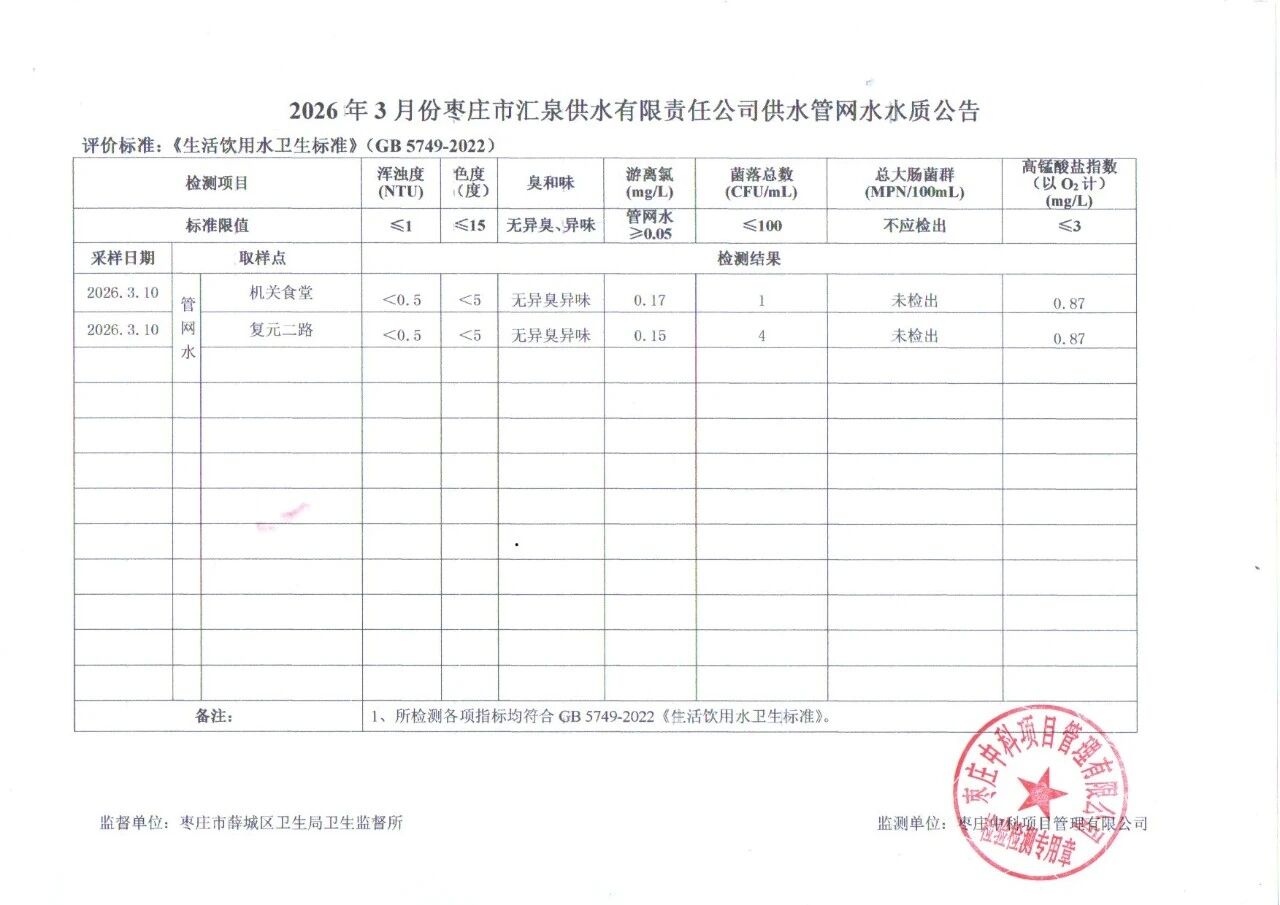 【水质信息】枣庄市汇泉供水有限责任公司2026年3月供水管网水水质公告