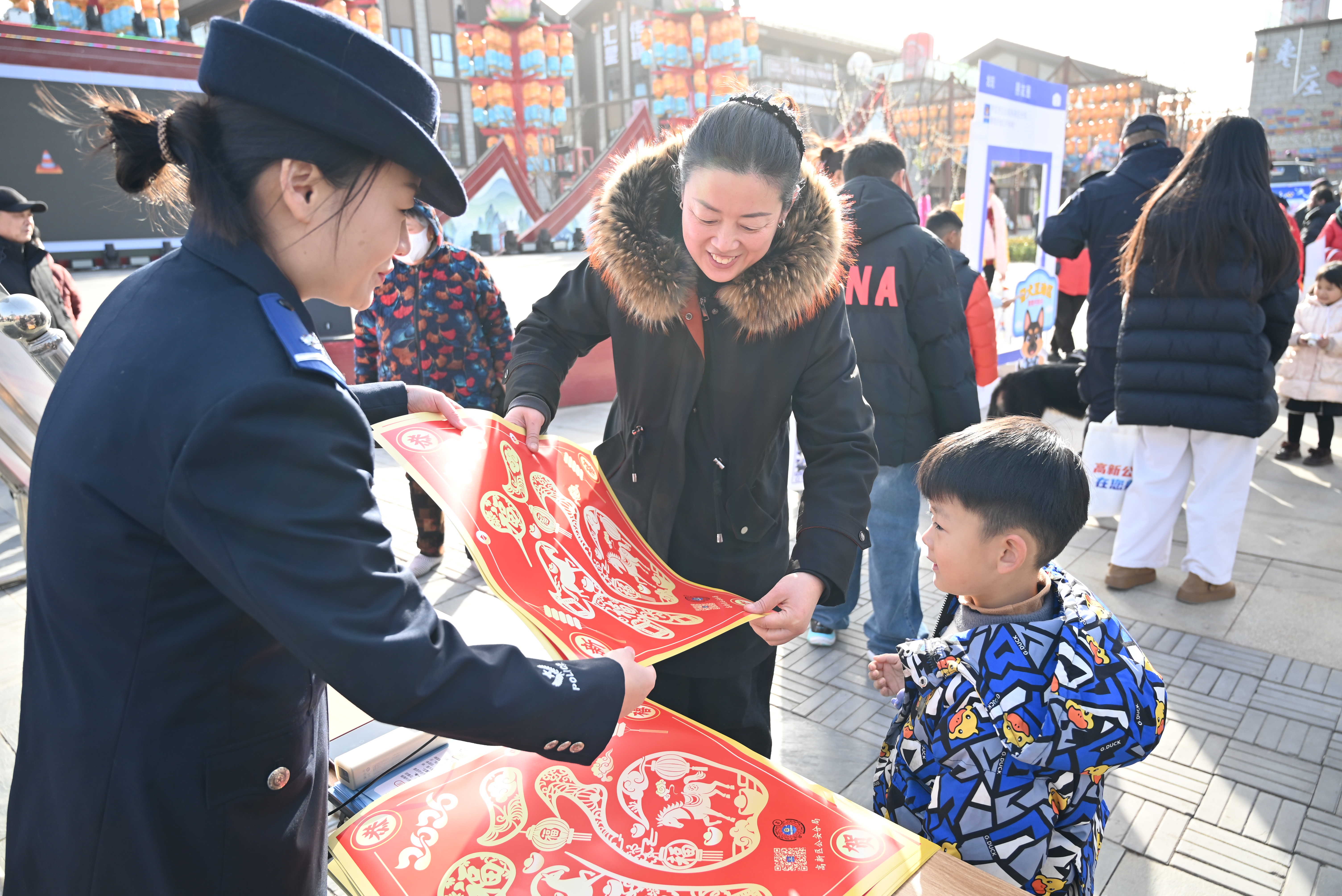 期间,分局民警、辅警通过摆放宣传展板、发放宣传手册、现场讲解等形式,重点普及反电信网络诈骗、交通安全、禁毒、防拐骗等与群众生产生活密切相关的法律知识和安全防范技能,耐心细致地为大家讲解警械装备的功能、使用场景及操作流程,介绍警犬训练相关知识,还邀请群众近距离与警犬互动、触摸体验警械装备,让大家直观感受公安科技化、现代化建设成果,不少群众纷纷拍照留念。不少家长带着孩子前来参与,孩子们在民警的引导下与警犬“亲密接触”,学习安全知识,在心中悄悄种下了“警察梦”的种子。现场还为群众赠送福字春联,向参与活动的群众发放警察小熊纪念品,将节日的祝福与温暖传递给现场群众。