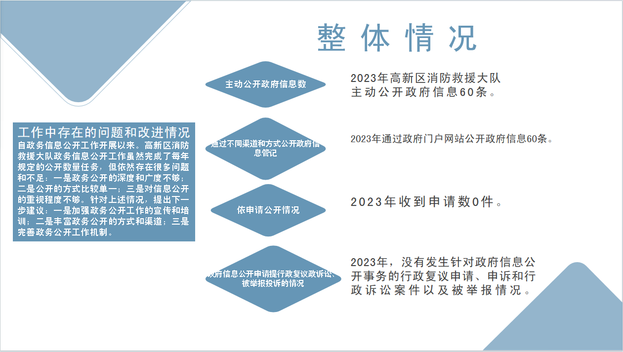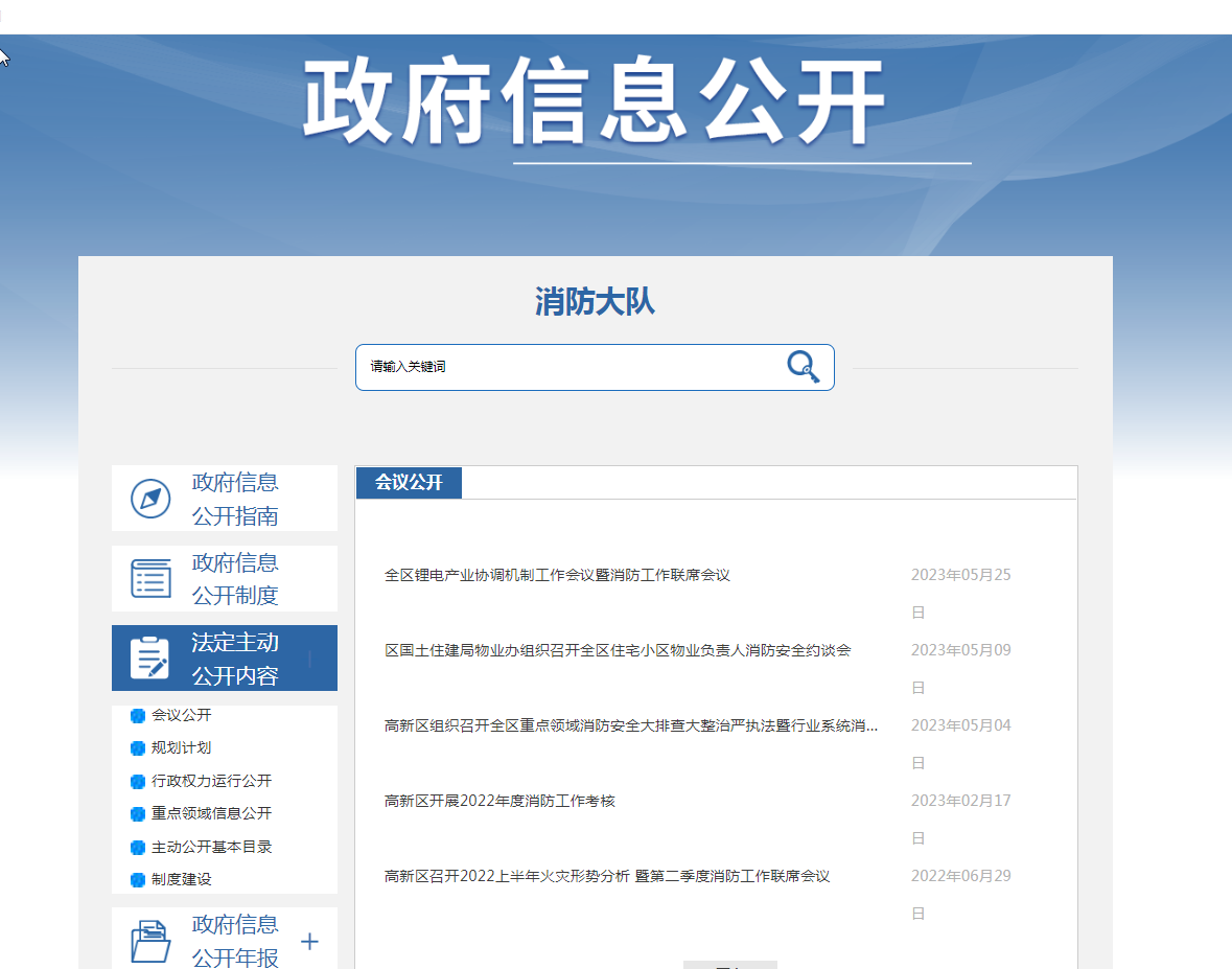 2023年1月1日至2023年12月31日高新区消防救援大队在政务公开网站中主动发布信息60条,主要内容有部门信息、部门办公会议公开及解读、政策公开及解读等。