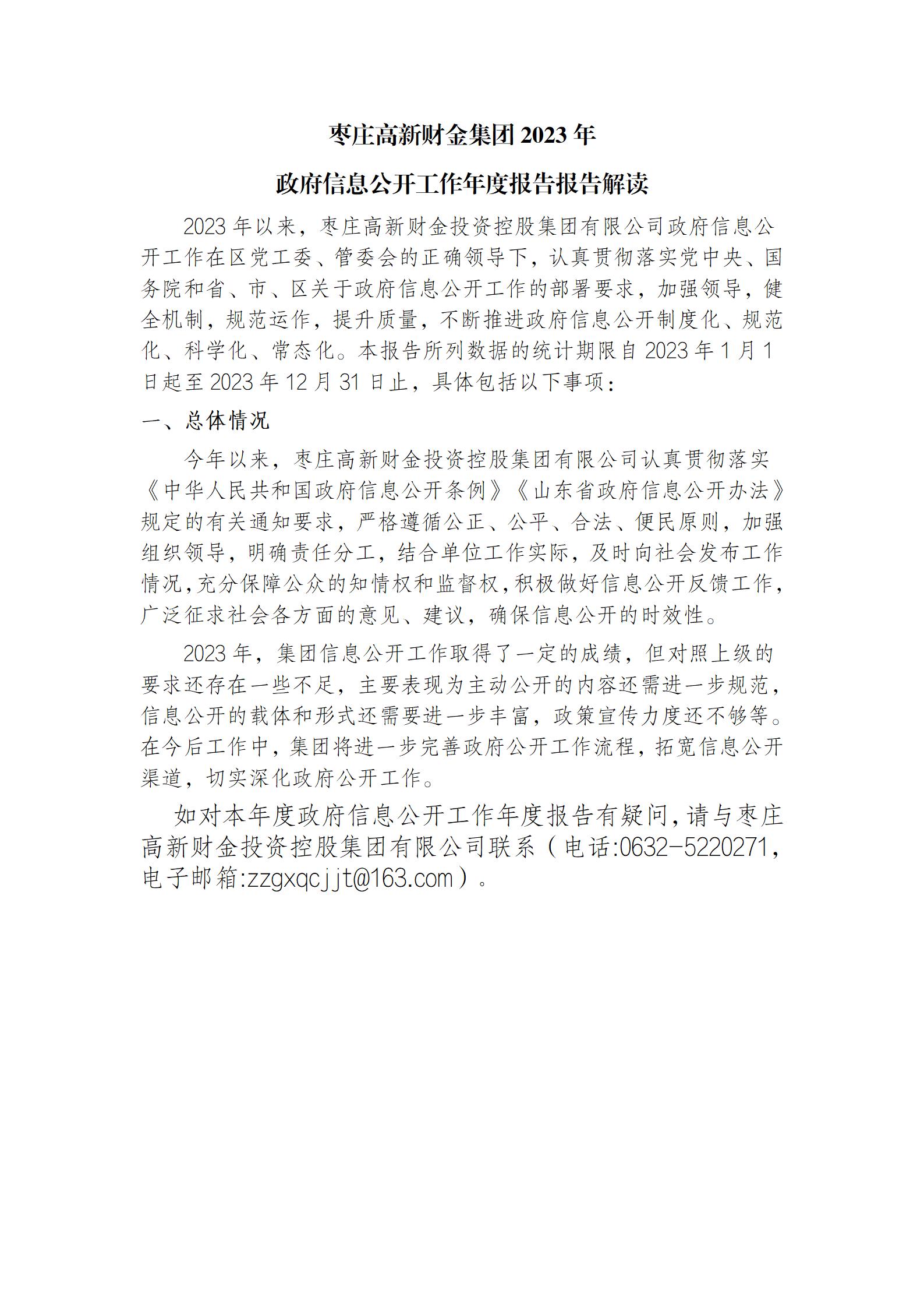 本报告根据《中华人民共和国政府信息公开条例》《中华人民共和国政府信息公开工作年度报告格式》的通知(国办公开办函〔2021〕30号)和省、市、区有关工作要求,由枣庄高新财金集团编制。全文包括2023年政府信息公开工作要点落实情况,主动公开政府信息情况,回应解读情况,依申请公开情况,政府信息公开行政复议、行政诉讼和投诉情况,存在的主要问题及改进措施等。本报告所列数据的统计时限自2023年1月1日至2023年12月31日。本报告全文将在枣庄高新区官网(http://www.zzctp.gov.cn/)“政府信息公开年度报告”专栏公布。如对本报告有疑问,请与枣庄高新财金集团综合部联系(联系电话:0632-5220271,电子邮箱:gxcyxq@163.com)。