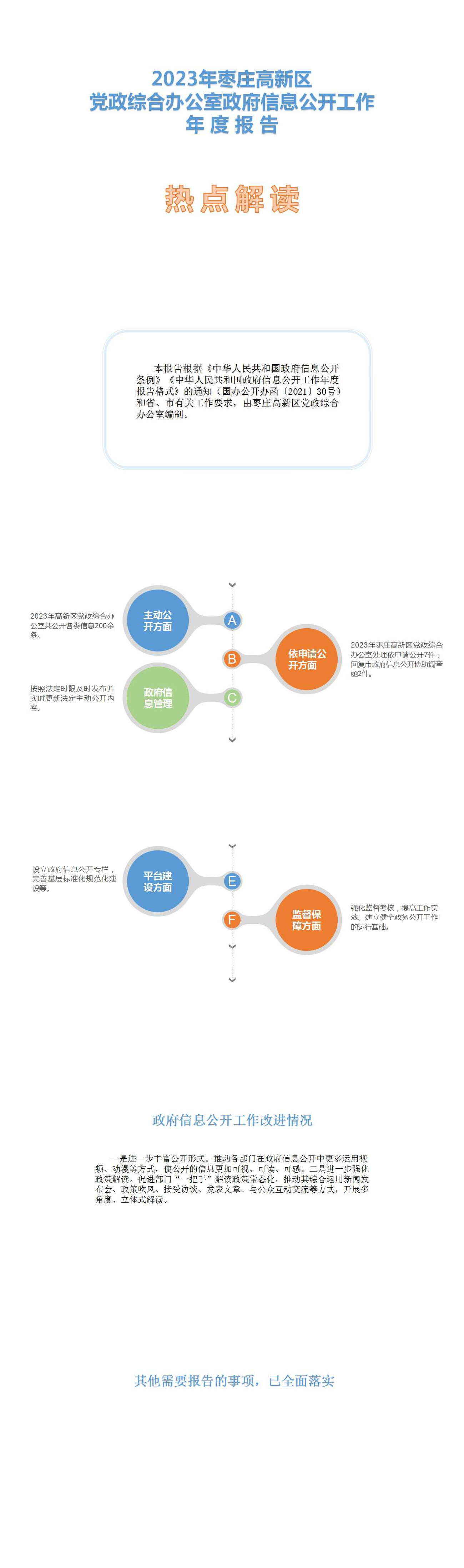 本报告根据《中华人民共和国政府信息公开条例》《中华人民共和国政府信息公开工作年度报告格式》的通知(国办公开办函〔2021〕30号)和省、市有关工作要求,由枣庄高新区党政综合办公室编制。全文包括2023年政府信息公开工作要点落实情况,主动公开政府信息情况,回应解读情况,依申请公开情况,政府信息公开行政复议、行政诉讼和投诉情况,存在的主要问题及改进措施等。本报告所列数据的统计时限自2023年1月1日至2023年12月31日。本报告全文将在枣庄高新区官网(http://www.zzctp.gov.cn/)“政府信息公开年度报告”专栏公布。如对本报告有疑问,请与枣庄高新区党政综合办公室信息科联系(联系电话:0632-8626577,电子邮箱:gxqzwgkb@163.com)。