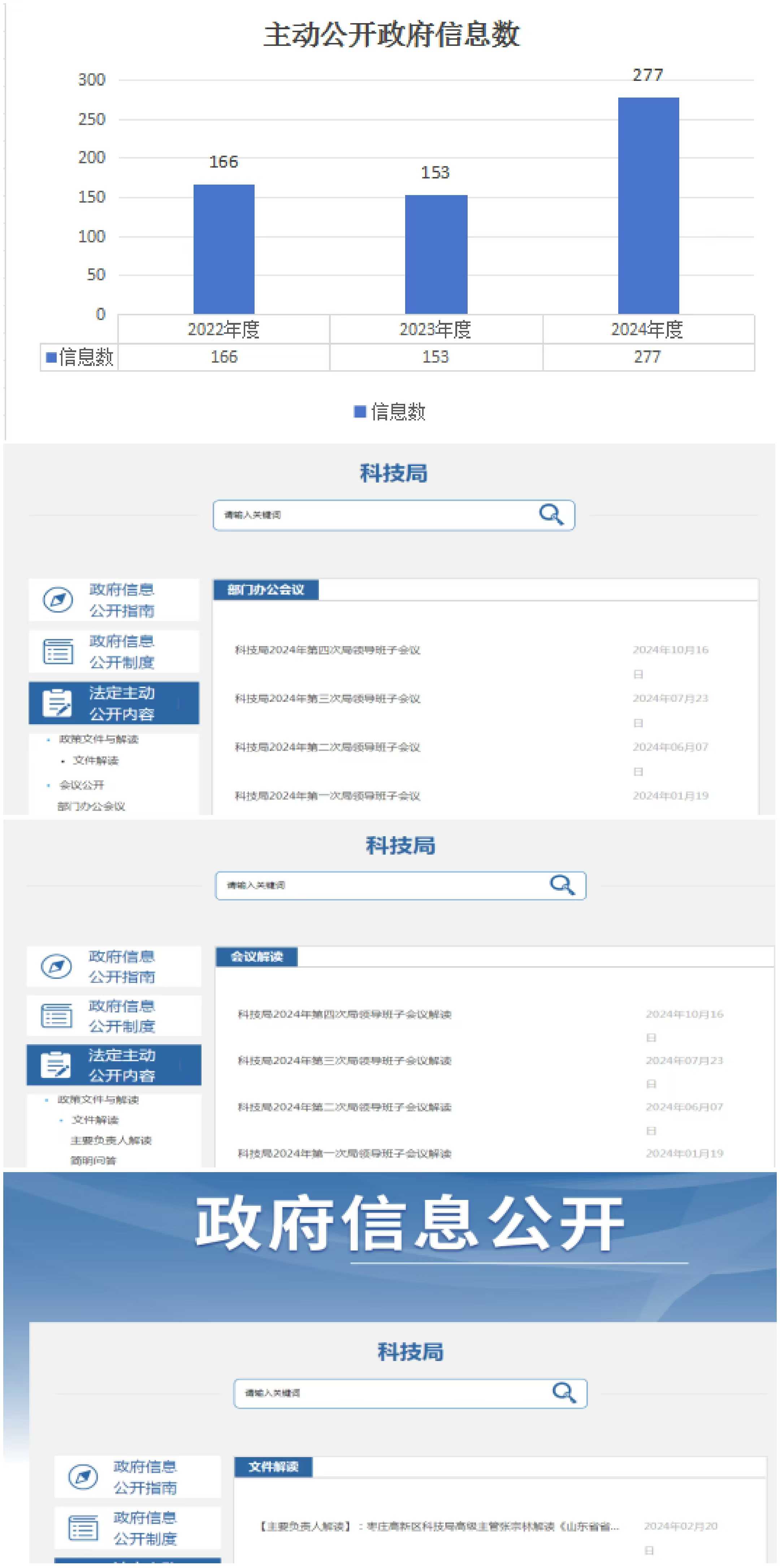 2024年,科技局政府信息公开工作能够稳步推进落实,整体水平得到了有效提升,按照要求还有差距,主要是信息公开的积极性有所欠缺,创新性和服务性依旧优待提升。(一)存在的主要问题:1、政务公开内容不全面。2、公开信息不及时。3、公开信息不准确。(二)改进情况:一是健全长效机制,确保任务和压力传导。加大政府信息公开网栏目维护监督管理力度,确保政府信息公开工作效率。二是突出公开工作重点,提优服务水平。做到把握全面、突出重点,确保政府信息公开工作质量。三是加大指导培训力度,夯实能力基础。对各科室、进行集中业务培训,强化对点对点指导等形式,全面提高政务公开工作人员的理论和实践水平。