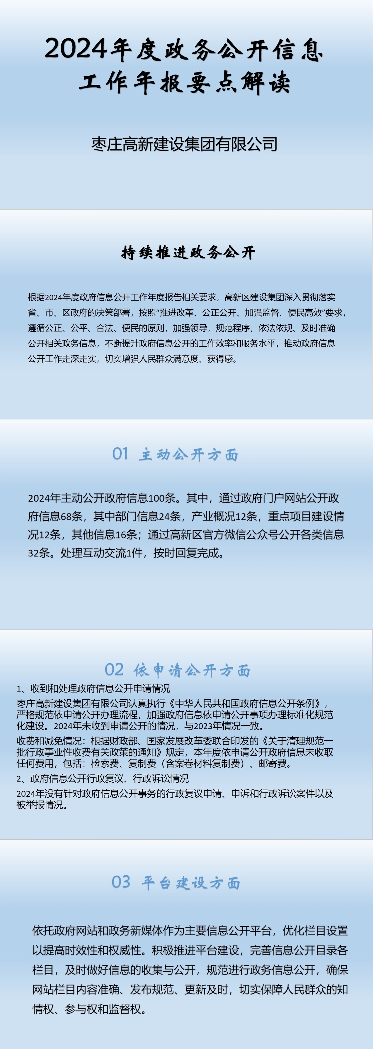 根据2024年度政府信息公开工作年度报告相关要求,枣庄高新建设集团有限公司深入贯彻落实省、市、区政府的决策部署,按照“推进改革、公正公开、加强监督、便民高效”要求,遵循公正、公平、合法、便民的原则,加强领导,规范程序,依法依规、及时准确公开相关政务信息,不断提升政府信息公开的工作效率和服务水平,推动政府信息公开工作走深走实,切实增强人民群众满意度、获得感。