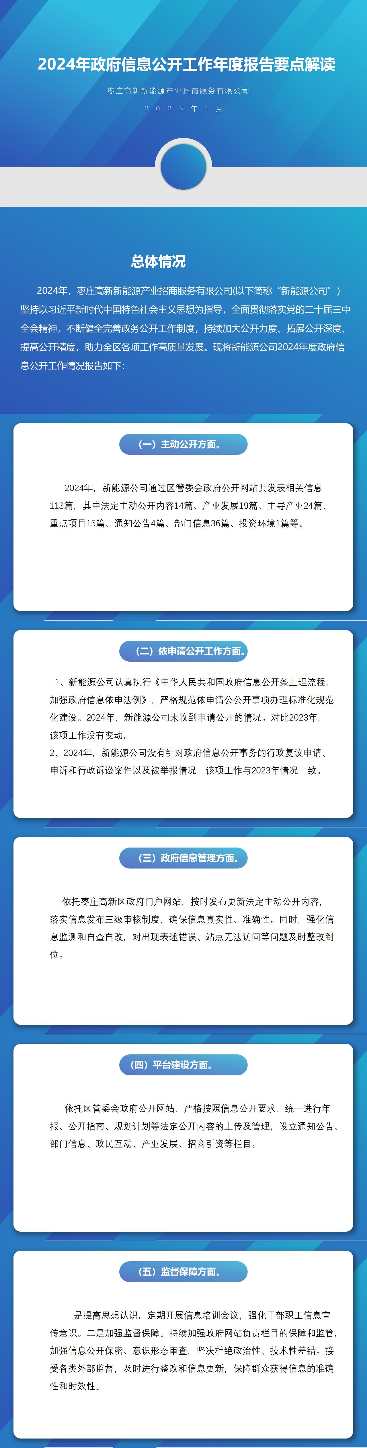 本报告根据《中华人民共和国政府信息公开条例》《中华人民共和国政府信息公开工作年度报告格式》的通知(国办公开办函〔2021〕30号)和省、市、区有关工作要求,由枣庄高新新能源产业招商服务有限公司编制。全文包括2024年政府信息公开工作要点落实情况,主动公开政府信息情况,回应解读情况,依申请公开情况,政府信息公开行政复议、行政诉讼和投诉情况,存在的主要问题及改进措施等。本报告所列数据的统计时限自2024年1月1日至2024年12月31日。本报告全文将在枣庄高新区官网(http://www.zzctp.gov.cn/)“政府信息公开年度报告”专栏公布。如对本报告有疑问,请与枣庄高新新能源产业招商服务有限公司综合部联系(联系电话:0632-8261819,电子邮箱:gxcydq@163.com)。
