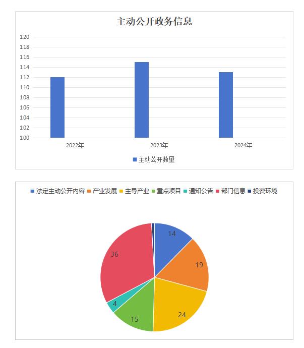 (一)主动公开方面。2024年,新能源公司通过区管委会政府公开网站共发表相关信息113篇,其中法定主动公开内容14篇、产业发展19篇、主导产业24篇、重点项目15篇、通知公告4篇、部门信息36篇、投资环境1篇等。