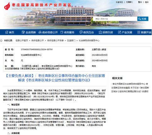 政策文件方面,2024年主动公开枣庄市高新区社会事务综合服务中心文件2件,依申请公开0件,不予公开0件,网上公开了2件,配发解读材料2件。其中主要负责人解读1件、简明问答解读1件。