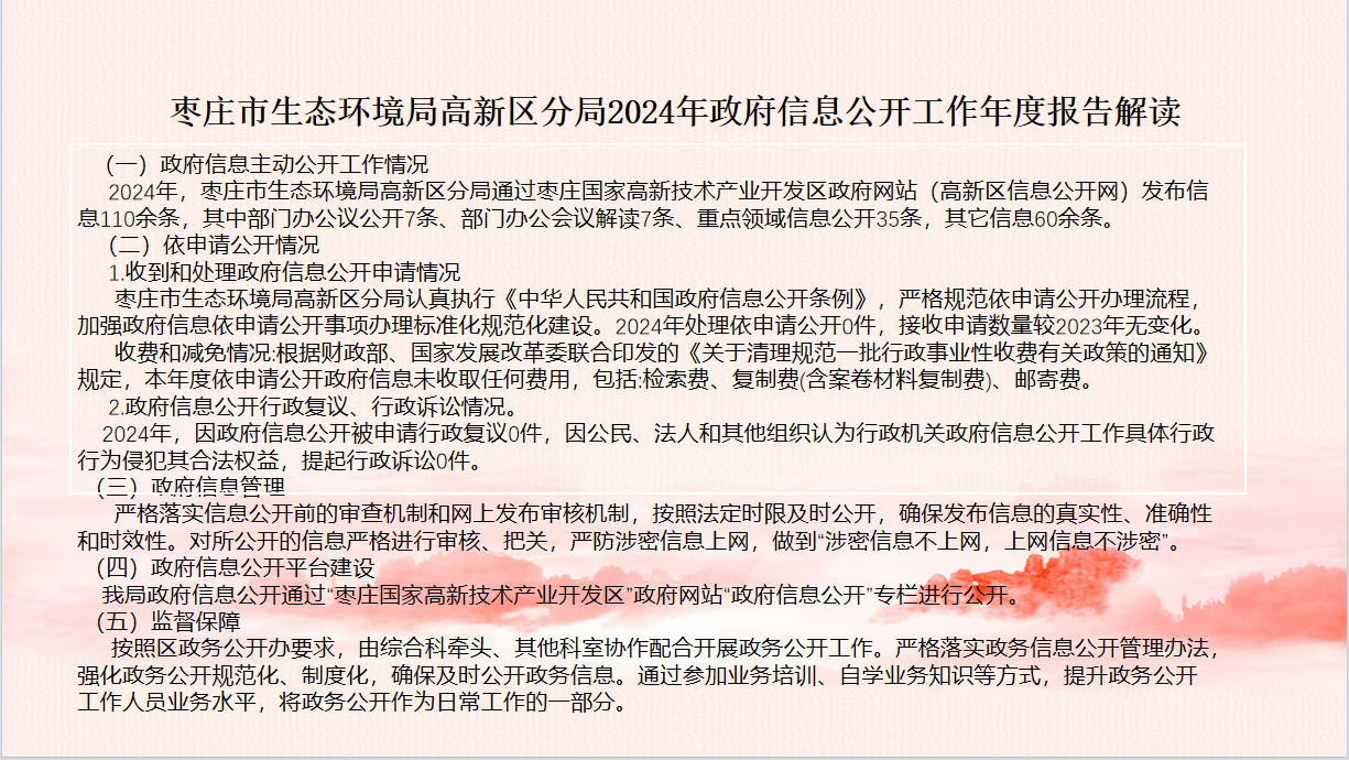 2024年,枣庄市生态环境局高新区分局通过枣庄国家高新技术产业开发区政府网站(高新区信息公开网)发布信息110余条,其中部门办公议公开7条、部门办公会议解读7条、重点领域信息公开35条,其它信息60余条。