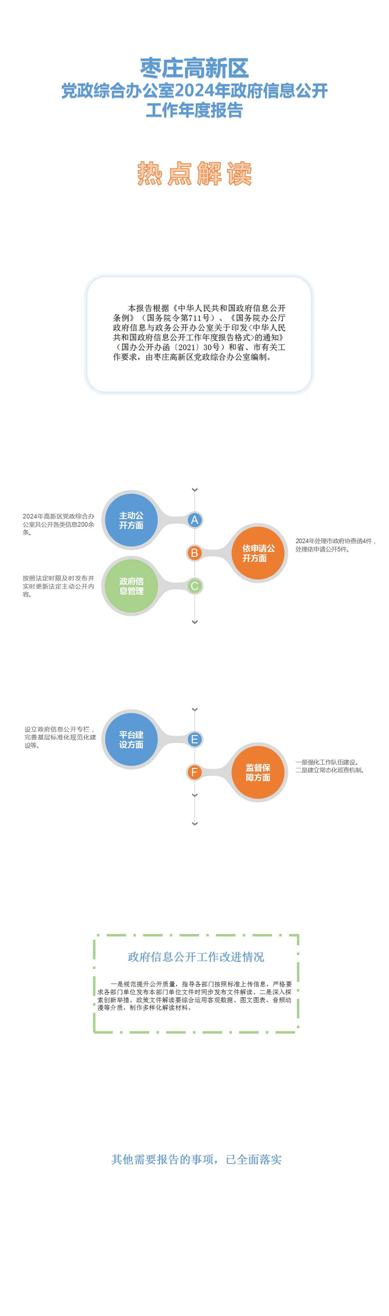 2024年,枣庄高新区认真贯彻落实国家、省、市关于政务公开各项工作部署,努力提高服务大局、服务基层、服务群众的能力,不断提升我区政务公开规范化水平,主要内容包括主动公开政府信息情况、依申请公开情况、政府信息管理情况、政府信息公开平台建设情况、监督保障情况等。现将我区2024年度政府信息公开工作情况报告如下:
